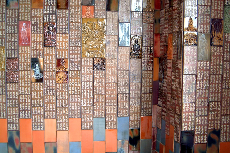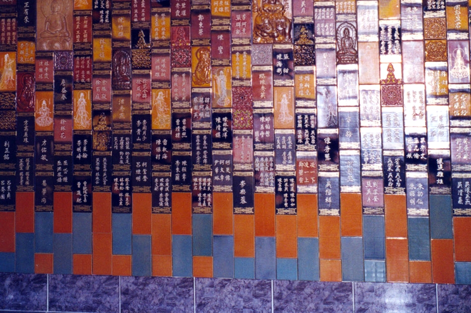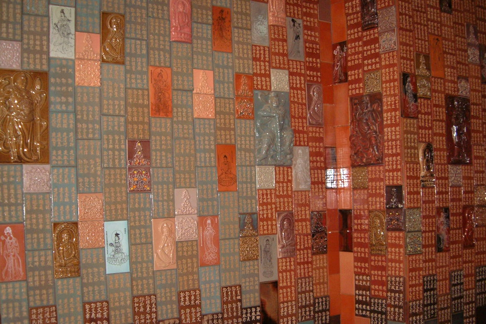 第二次利用大量不同尺寸的量製化陶片,將功德主姓名列於陶壁上,穿插佛像、蓮花及特別設計的圖樣,組合成的陶壁穿越整個雲居樓長廊,實為壯觀。