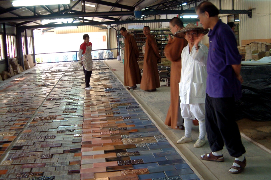 第二次利用大量不同尺寸的量製化陶片,將功德主姓名列於陶壁上,穿插佛像、蓮花及特別設計的圖樣,組合成的陶壁穿越整個雲居樓長廊,實為壯觀。